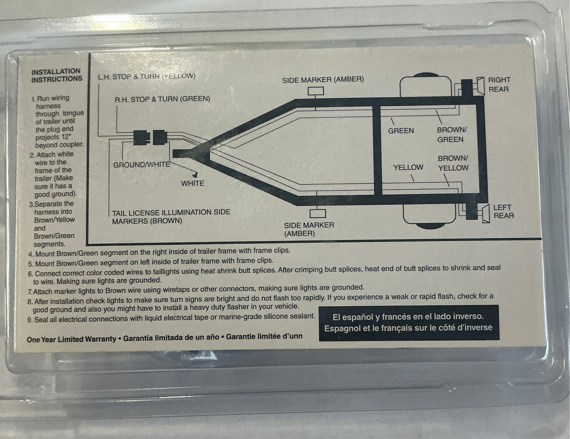 | Seachoice Flat 4 Pole Trailer "Y" Harness With Marine-Grade Tinned Wire Consists of 48" vehicle side connector and 25' trailer side color coded wires. Trailer side "split" to allow routing of wire down both sides of trailer for easy hook-up. Safe color coded wires. Includes 6 frame straps and 2 quick splice connectors. 18 Ga. Marine grade tinned wire |
